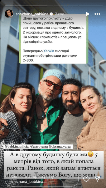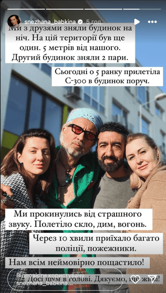 Важливо"Ми з друзями орендували будинок на ніч. На цій території був ще один за п'ять метрів від нашого. Другий будинок орендували дві пари. Сьогодні (24 липня – ред.) о п'ятій ранку прилетіла С-300 в будинок поруч. Ми прокинулись від страшного звуку. Полетіло скло, дим, вогонь. Через 10 хвилин приїхало багато поліції, пожежники. Нам всім неймовірно пощастило! Досі шум у голові. Дякуємо, що живі", — написала Сніжана Бабкіна.
