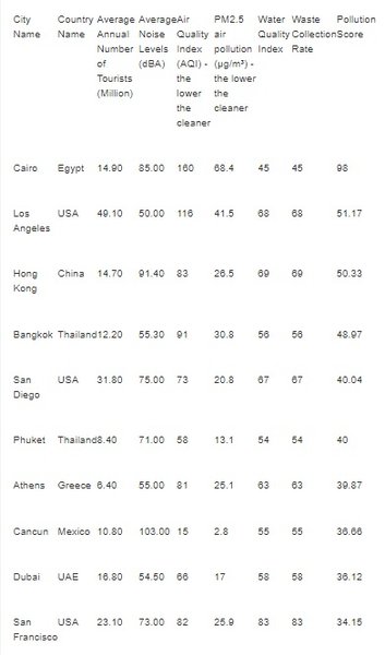 Рейтинг складений за результатами дослідження, проведеного DIPNDIVE у найбільш відвідуваних містах світу. Забруднення вимірювалося з використанням ключових показників, як-от індекс якості повітря, концентрація PM2.5 (найдрібніші частинки повітря, що можуть завдати шкоди здоров'ю людини), індекс якості води та рівень шуму.