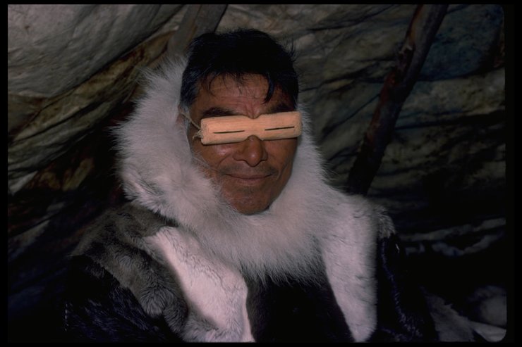 Ми знаємо, що мідні інуїти Крайньої Півночі Канади та юпіки Аляски носили різні види снігових окулярів, зроблених з рогів або китового вуса і з крихітними горизонтальними прорізами. Власники дивилися через них і захищалися від яскравого світла снігу під час полювання. Водночас, дуже вузькі отвори для очей допомагали їм зосередитися на здобичі.