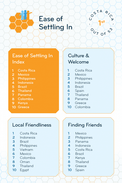 Саме Коста-Ріка посіла перші місця в усіх категоріях. Респонденти зазначили, що країна дуже гостинна. З цим погодилися 88%, що на 25% вище середнього рівня гостинності по всьому світу. Багато хто зазначив, що їм було легко звикнути до місцевої культури (35%, як порівняти із середнім показником у 21% по всьому світу).