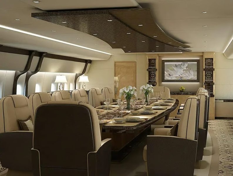 У підсумку пасажирський лайнер перетворили на двоповерховий літаючий палац. Інтер'єр літака розділений на багато прикрашені люкси, вітальні, їдальні, зони відпочинку для пасажирів і ванні кімнати.