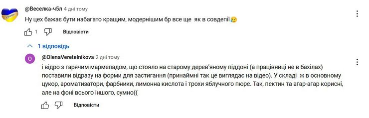 "Ну, цех бажає бути набагато кращим, модернішим, бо все ще, як у совдепії", "І відро з гарячим мармеладом, що стояло на старому дерев'яному піддоні (а робітниці не в бахілах), поставили віддразу на форми для застигання (принаймні, так це виглядає на відео). У складі ж, в основному, цукор, ароматизатори, барвники, лимонна кислота і трохи яблучного пюре. Так, пектин і агар-агар корисні, але на тлі всього іншого, сумно", — пишуть під публікацією.