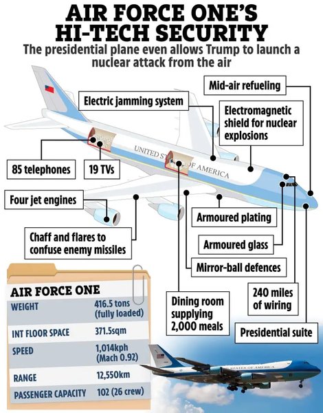 Літаки Air Force One Трампа, що використовуються нині, оснащені десятками спеціалізованих систем безпеки. До них відносяться броньоване скло та обшивка, бортові освітлювальні ракети для збивання з пантелику ворожих ракет, дзеркальні кульові захисні системи й навіть система електричних перешкод. Ще одним унікальним, але необхідним елементом є електромагнітний екран від ядерних вибухів, оскільки глава Білого дому дійсно може запустити ядерну бомбу з цього літака.