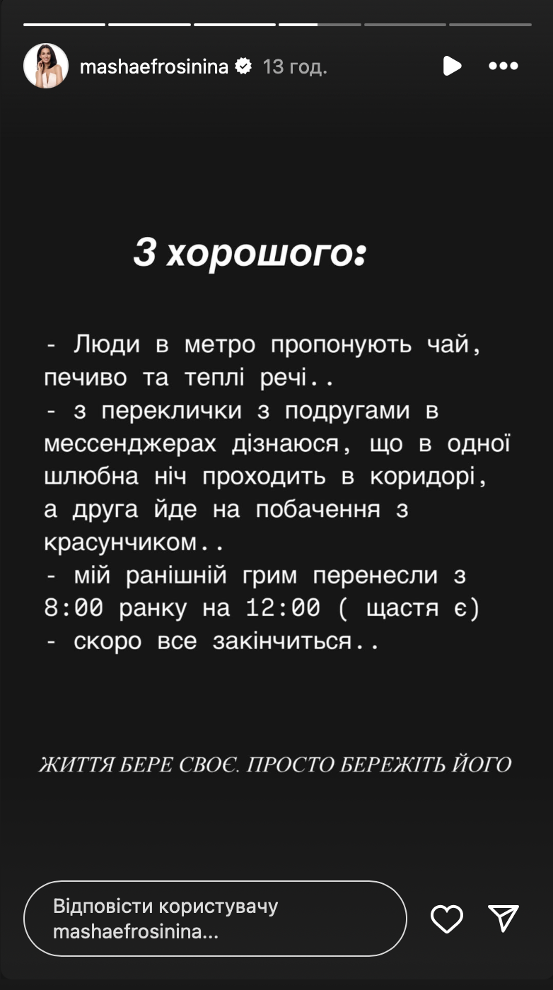 "Мій ранішній грим перенесли з 8:00 на 12:00 (щастя є). Скоро все закінчиться… Життя бере своє. Просто бережіть його", – зазначила Маша Єфросиніна.