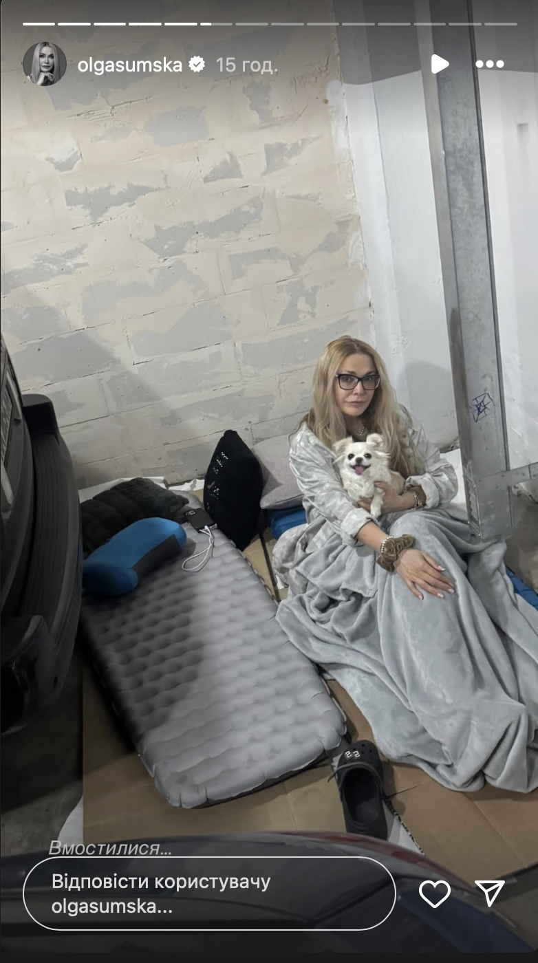 Тим часом акторка Ольга Сумська показала, як разом з домашнім улюбленцем та ковдрою ховалася вночі в гаражі. Зірка екрану сказала, що її менша донька Ганна спить в машині, а для чоловіка підготовлений матрац.