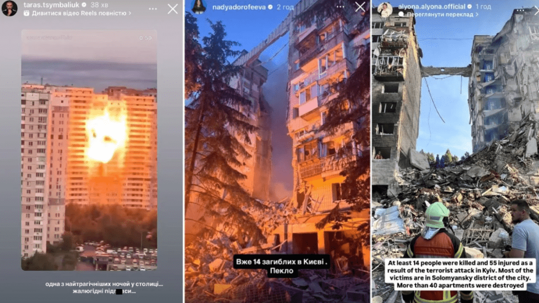 Співачка Надя Дорофєєва показала зруйновану багатоповерхівку. "Справжнє пекло", — прокоментувала вона, підкресливши масштаб трагедії. А от Наталка Денисенко зізналася, що дивом проспала атаку, але вранці побачила всі жахливі наслідки: "Ми прокинулися у фільмі жахів".