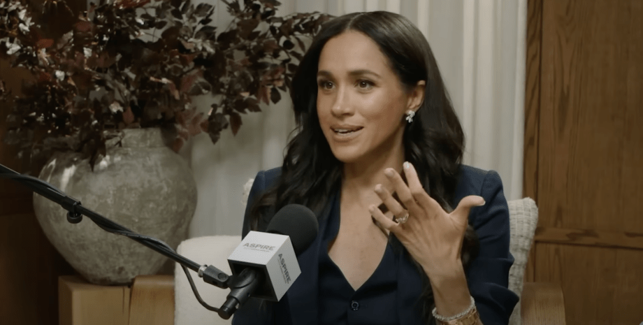 Вбрання дружини принца Гаррі оцінили у блозі Royal Fashion Daily. На подкаст Aspire With Emma Grede Меган прийшла в діловому костюмі з дорогими прикрасами.
