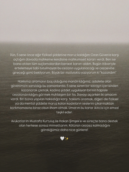 Судовий процес за позовом Булустуз тривав п'ять років, і вирок пролунав у 58-му кримінальному суді першої інстанції Стамбула. Ні Озан Гювен, ні Деніз Булутсуз не були присутніми на засіданні з ухвалення вироку у справі, відправивши туди своїх адвокатів, повідомляє Karar.