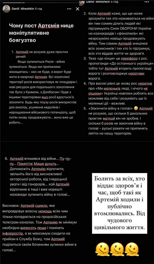 Інший актор Данило Мірешкін також відповів на допис Єгорова і назвав його "маніпулятивним боягузтвом" і прикладом поширення ворожих наративів.