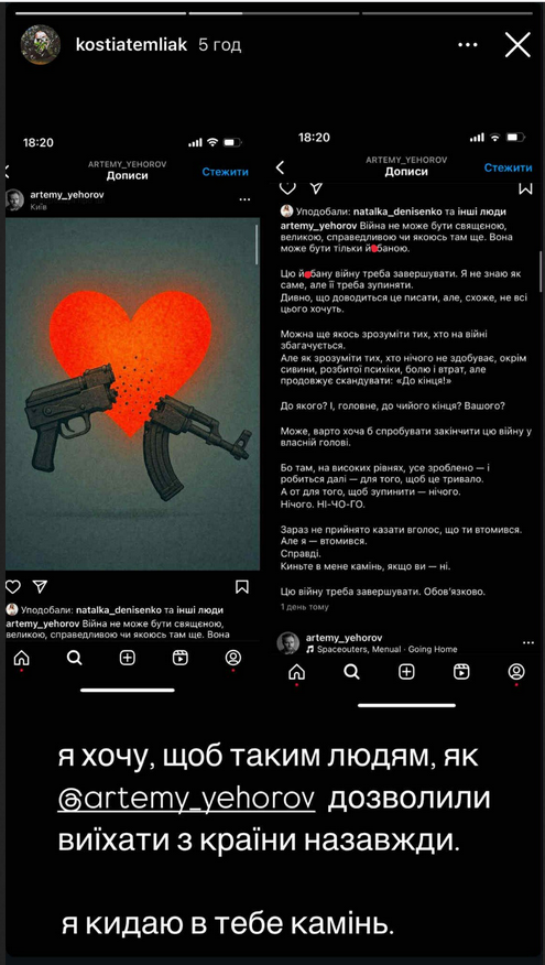 Так, актор Костянтин Темляк, який зараз служить у ЗСУ, заявив: "Я хочу, щоб таким людям, як Артемій Єгоров, дозволити виїхати з країни назавжди".