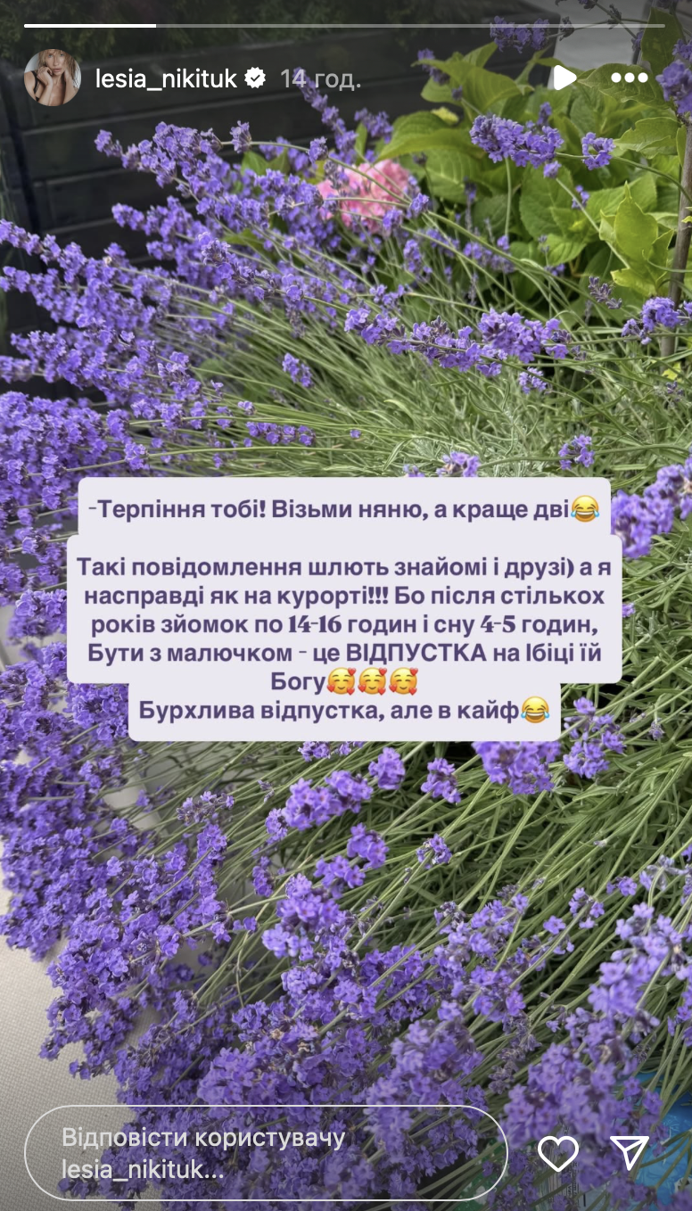 "А я насправді як на курорті. Бо після стількох років зйомок по 14-16 годин і сну 4-5 годин бути з малючком це відпустка на Ібіці їй Богу. Бурхлива відпустка, але в кайф", — зізналася Леся.