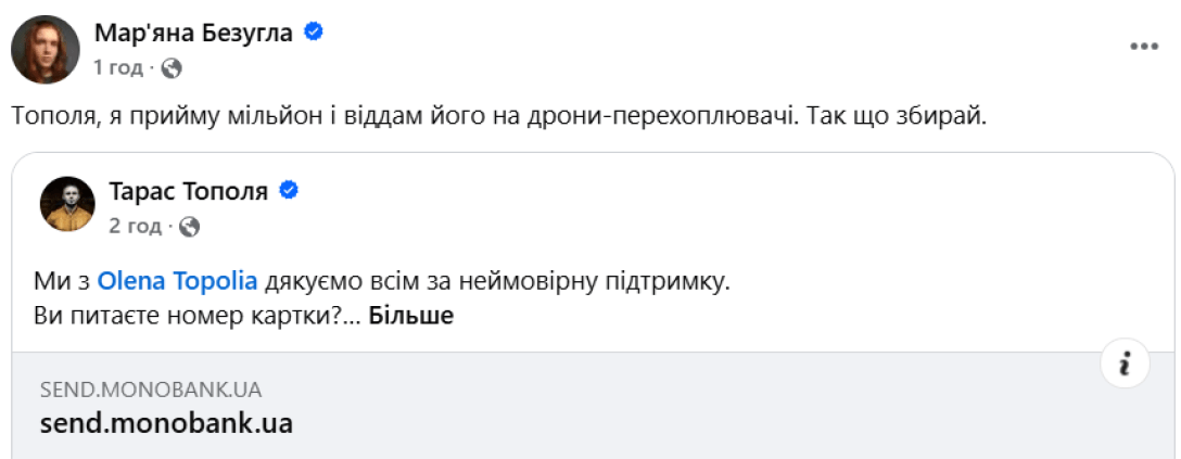 "Тополя, я прийму мільйон і віддам його на дрони-перехоплювачі. Так що збирай", — написала нардепка у своєму фейсбуці.