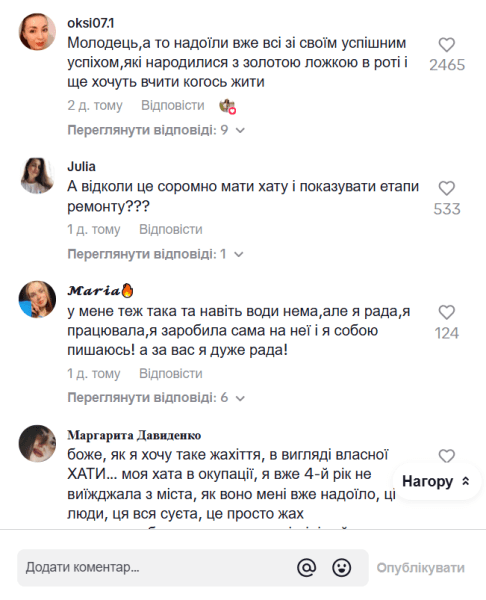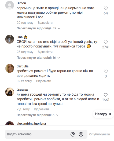 - "Своя хата — це вже ніфіга собі успішний успіх, тут не просто показувати, тут пишатися треба", — написала одна з учасниць обговорення, зібравши понад дві тисячі вподобайок;