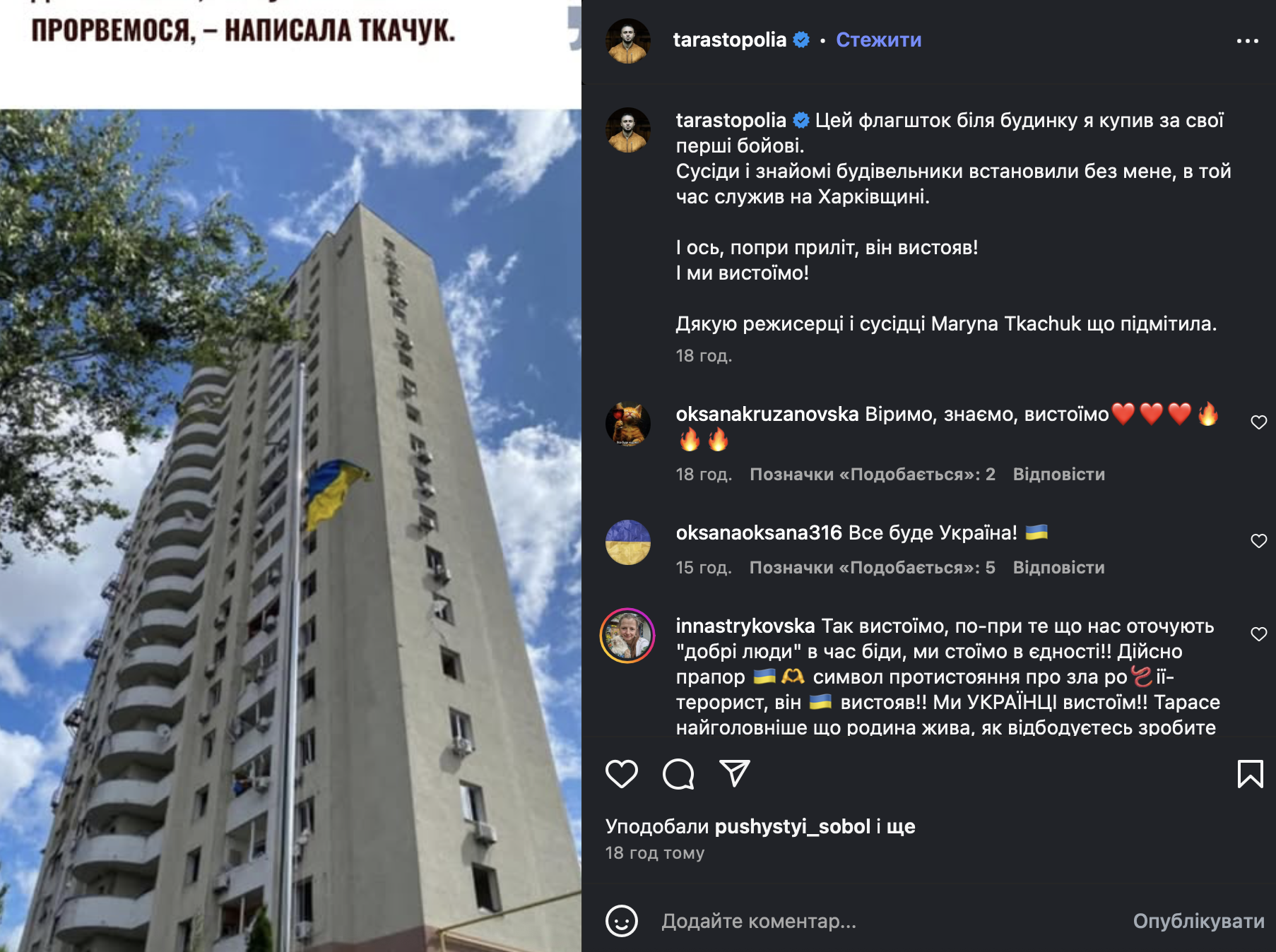 "Цей флагшток біля будинку я купив за свої перші бойові. Сусіди і знайомі будівельники встановили без мене, в той час служив на Харківщині. І ось, попри приліт, він вистояв! І ми вистоїмо!" — написав лідер гурту "Антитіла".