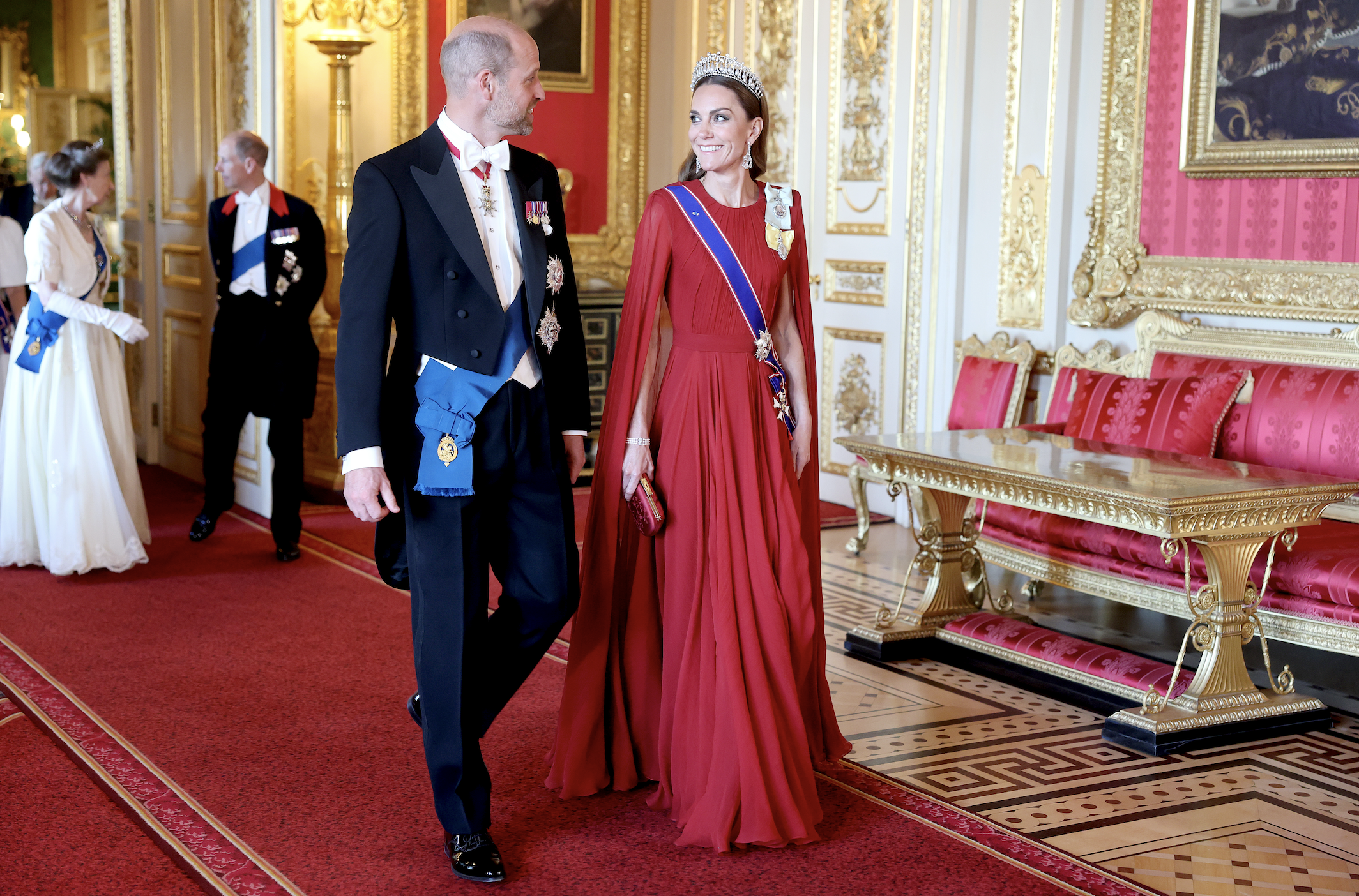 Майбутня королева зʼявилася в довгій вишневій сукні Givenchy, червоній накидці від Sarah Burton та туфлях Jimmy Choo, а принц Вільям вийшов у світ у фраку з орденами й відзнаками, серед яких — Орден Підв'язки.