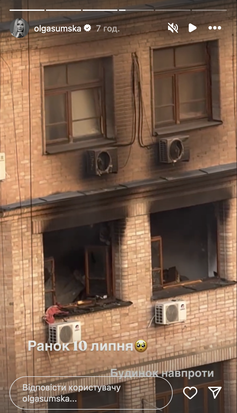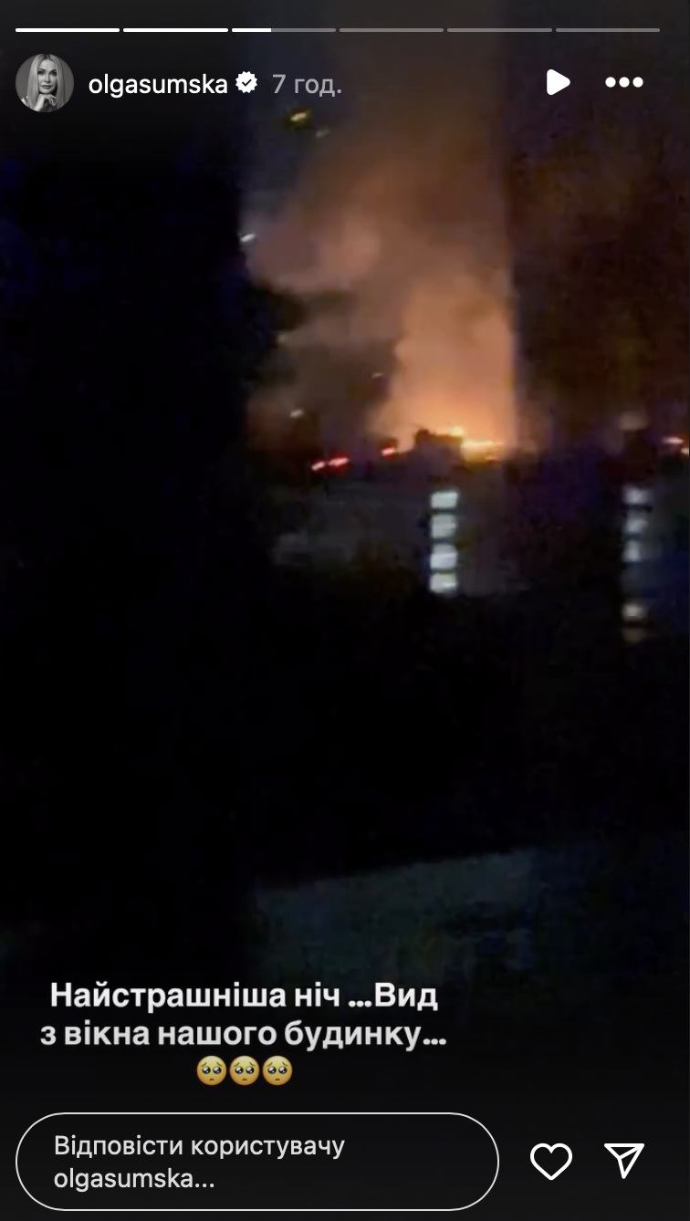 Сумська у своєму Instagram розповіла, що постраждав район, де вона живе. Ба більше, знаменитість показала, як з її вікна вночі було видно стовпи диму та вогонь після вибухів.