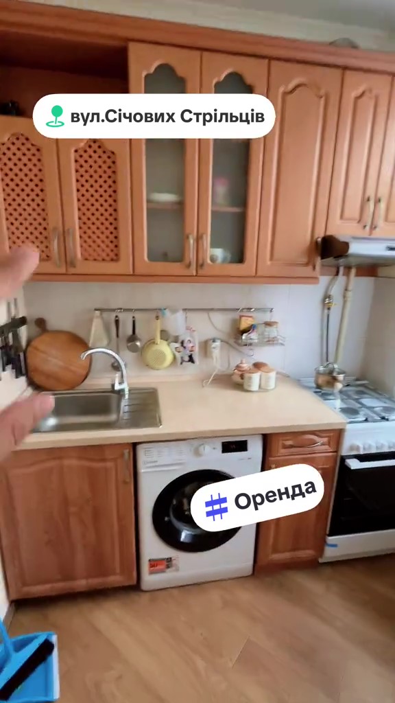 "Давайте я вам покажу саму квартиру. Ось ми заходимо — це перша кімната. Телевізор, тумба, диван, кондиціонер. Проходимо в другу кімнату. Тут ліжко, велика шафа, ще одне ліжко. Квартира ідеально підходить для сім’ї з двома дітьми. Проходимо далі. Тут у нас санвузол. Є бойлер, все у плитці, дуже гарно. Дивіться, яке чудове серце (дзеркало у формі серця — Ред.). Ходімо далі. На кухні стіл, ось така пральна машина, плита, холодильник. Ще у коридорі є шафа", — розповідає чоловік у кадрі.