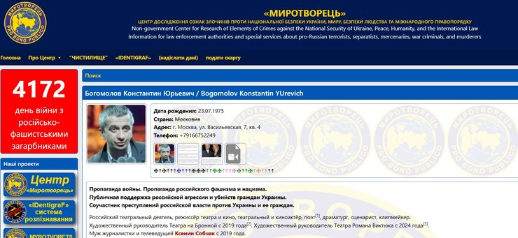 Уже 20 липня, після скандальної заяви, Богомолов опинився в базі сайту "Миротворець".