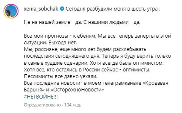 Зазначимо, що актор і режисер Максим Віторган, перший чоловік Ксенії Собчак, одразу ж зайняв чітку антивоєнну позицію і засудив дії Росії, заявивши про свою підтримку України.