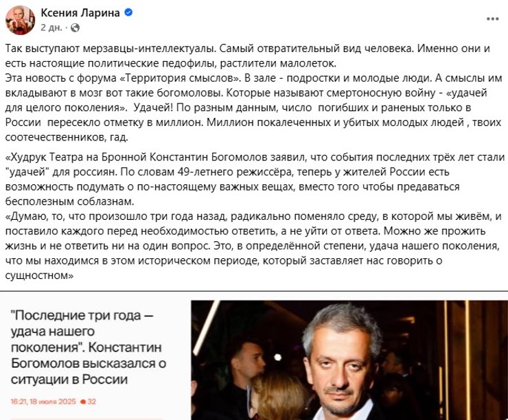 Ксенія Ларіна, колишня журналістка "Эха Москвы", яка залишила Росію і зараз визнана іноагенткою, написала в соцмережі про Богомолова: