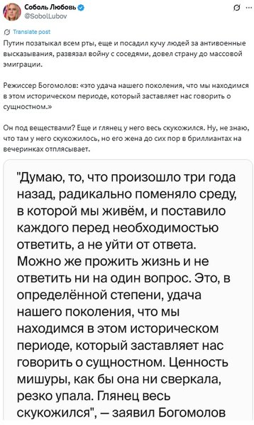 "Путін позатикав усім роти, ще й посадив купу людей за антивоєнні висловлювання, розв'язав війну з сусідами, довів країну до масової еміграції. Режисер Богомолов: "це удача нашого покоління, що ми перебуваємо в цьому історичному періоді, який змушує нас говорити про сутнісне." Він під речовинами? Ще й глянець у нього весь скукожився. Ну, не знаю, що там у нього скукожилося, але його дружина досі в діамантах на вечірках витанцьовує", — написала вона в Х.