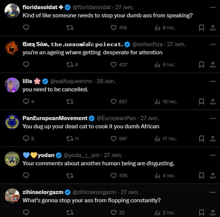 На платформі X співачка опублікувала фото виснаженого військовослужбовця та додала підпис англійською мовою: "Well something needed to stop his fat ass from eating" ("Щось потрібно було, щоб зупинити його товсту дупу від їжі"). Цей коментар спричинив численні критичні реакції.