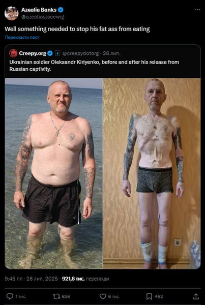Загалом, у публікації, яку репостнула Бенкс, на фото зображено головного сержанта снайперського взводу 36-ї бригади морської піхоти Олександра Кірієнка. Він брав участь в обороні "Азовсталі" у Маріуполі у 2022 році та потрапив у російський полон. За час перебування в неволі Кірієнко втратив приблизно 40 кілограмів та зазнав катувань.