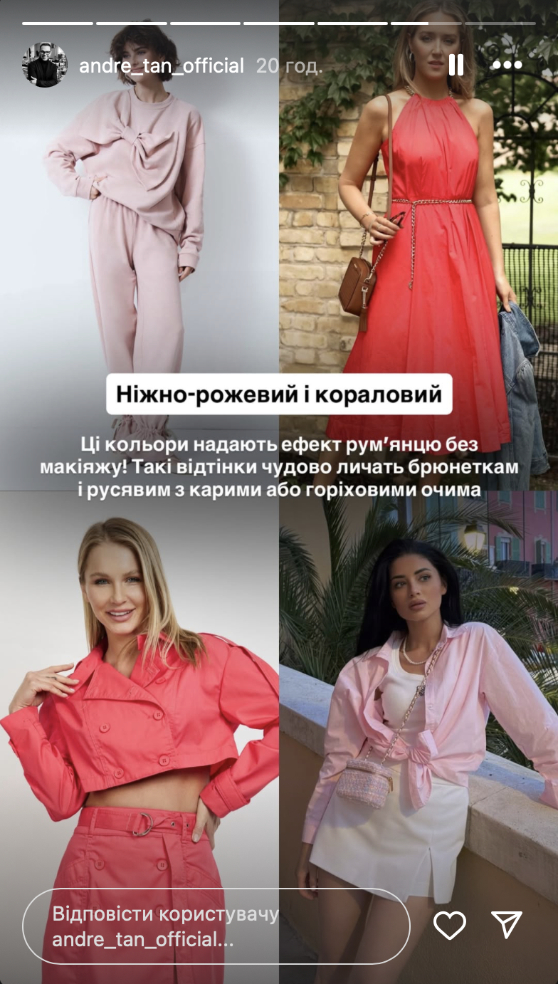 Зокрема, в один ряд Андре Тан поставив ніжно-рожевий і кораловий відтінки.