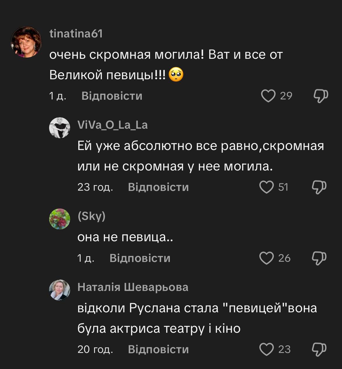 Її одразу ж розкритикували за неточність і зневагу — Руслана Писанка була акторкою та телеведучою, а не співачкою. У коментарях почали захищати оформлення місця поховання: