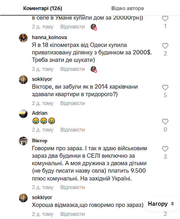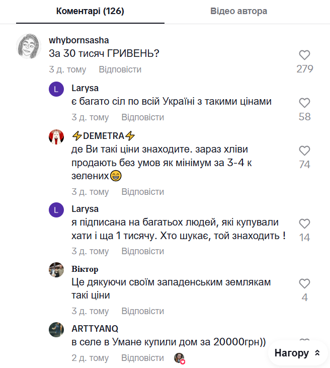 "За 30 тисяч гривень?" — здивувалась одна з підписниць у коментарях, розпочавши велику дискусію. "Є багато сіл по всій Україні з такими цінами", — відповіла їй інша глядачка.