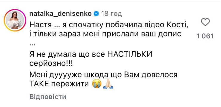 Акторка Наталя Денисенко не думала, що в цій ситуації "все настільки серйозно" і висловила почуття жалю щодо колишньої дівчини Темляка.