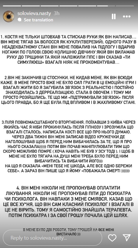 Декілька днів тому Анастасія Соловйова заявила, що стала жертвою домашнього насильства з боку актора Костянтина Темляка. 14 серпня вона в Instagram stories оприлюднила додаткові подробиці, прокоментувавши допис Темляка, де він відповів на попередні звинувачення.