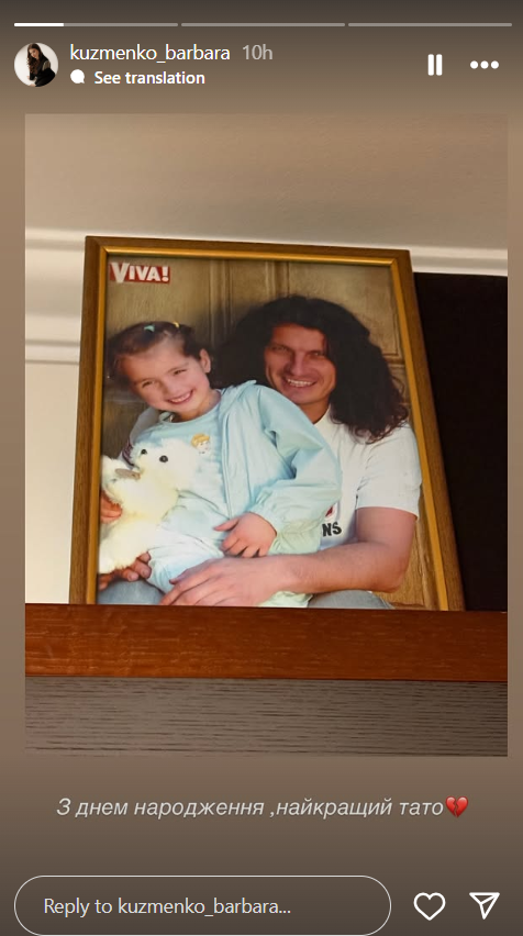 У своєму Instagram Марія-Барбара опублікувала дитячу світлину: на ній вона сидить на колінах у батька з іграшкою в руках, а Кузьма ніжно обіймає доньку та усміхається. Під фото дівчина привітала тата з днем народження.