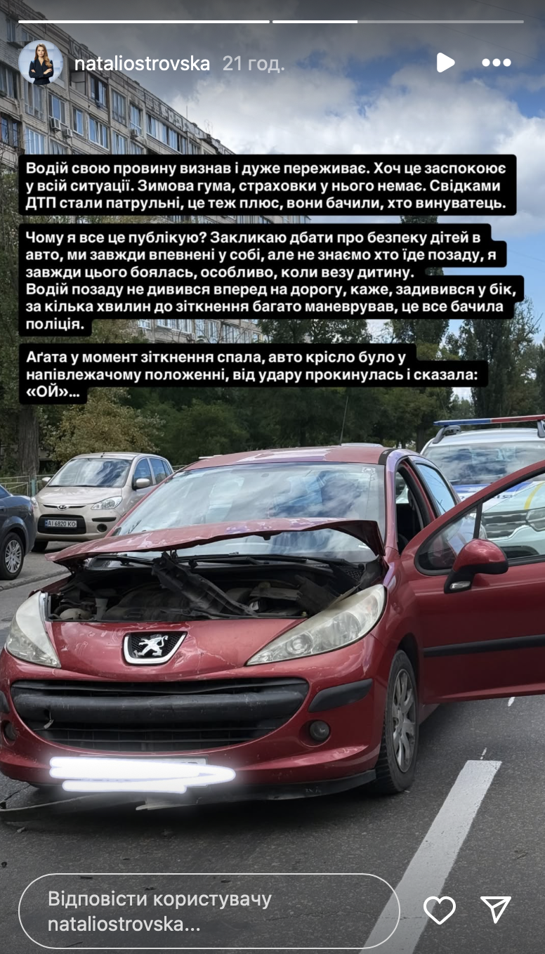 Маленька донька ведучої Аґата перебувала у спеціальному автокріслі та в цей момент спала. Про це Островська розповіла у своєму Instagram.