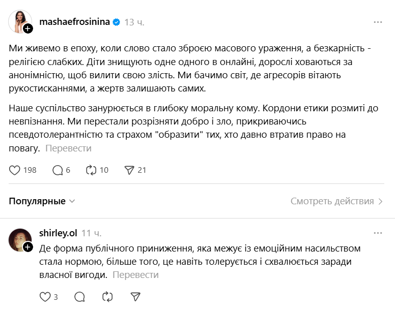 "Ми живемо в епоху, коли слово стало зброєю масового ураження, а безкарність — релігією слабких. Діти знищують одне одного в онлайні, дорослі ховаються за анонімністю, щоб вилити свою злість. Ми бачимо світ, де агресорів вітають рукостисканнями, а жертв залишають самих", — пише телеведуча в соціальній мережі Threads.
