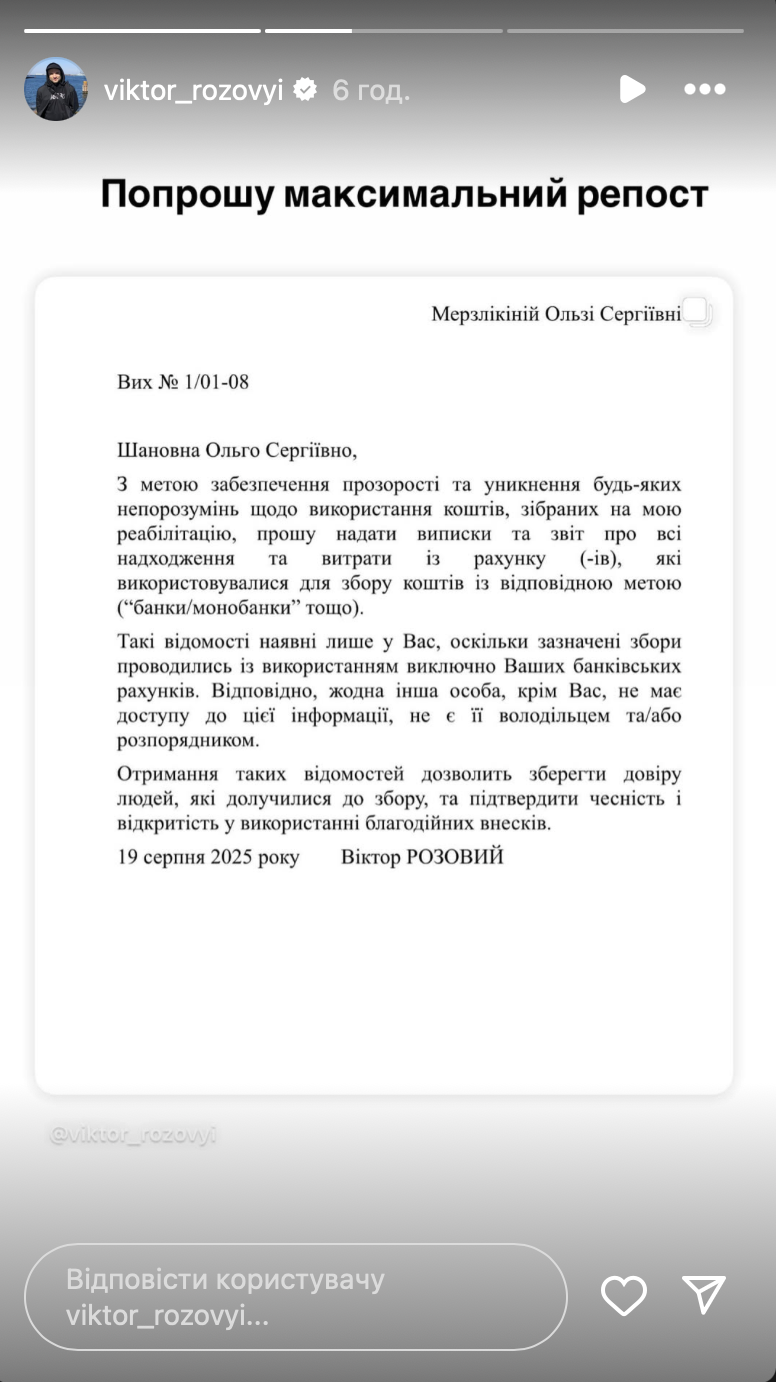 "Я щиро вдячний усім, хто підтримав мене, жертвуючи кошти на реабілітацію та лікування. Кожен внесок став проявом довіри та небайдужості. Саме тому, я вважаю за необхідне, забезпечити максимальну прозорість у цьому питанні… Я розумію, що частина коштів дійсно була витрачена на мої потреби (крісло для пересування, масажі, реабілітації тощо), але, поруч з цим, я переконаний, що ця цифра не вимірюється мільйонами гривень, та й, думаю, навіть не сотнями тисяч", — написав Розовий.