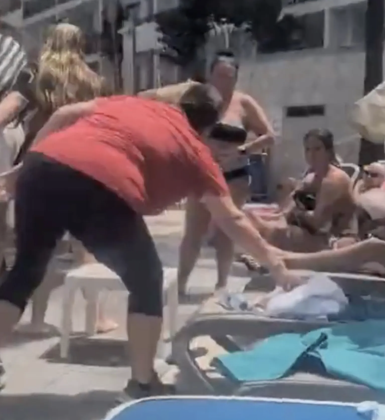 На кадрах видно жінку в червоному топі та темних шортах, яка люто хапає свою сумку з шезлонга, а потім вказує на групу туристів, які нібито зайняли її місце. Пройшовшись навколо басейну, вона починає кричати на іншого туриста. Про це пише The Sun.