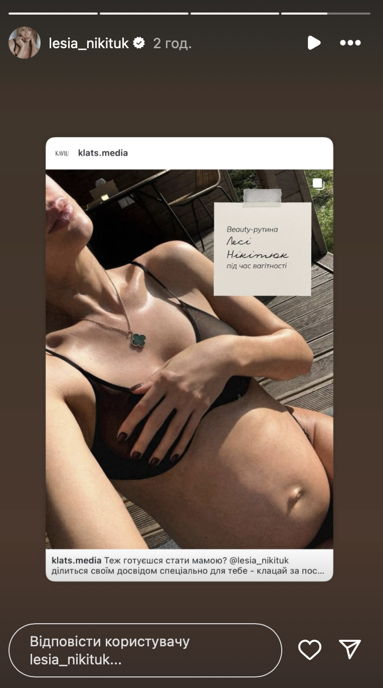 Зокрема, Леся показала раніше небачене фото з часів вагітності. На знімку вона засмагала на сонці з помітно округленим животом. Ба більше, телеведуча розкрила засоби, якими користувалася в той період: вона змащувала шкіру живота та стегон олійкою та батером (жирним кремом).