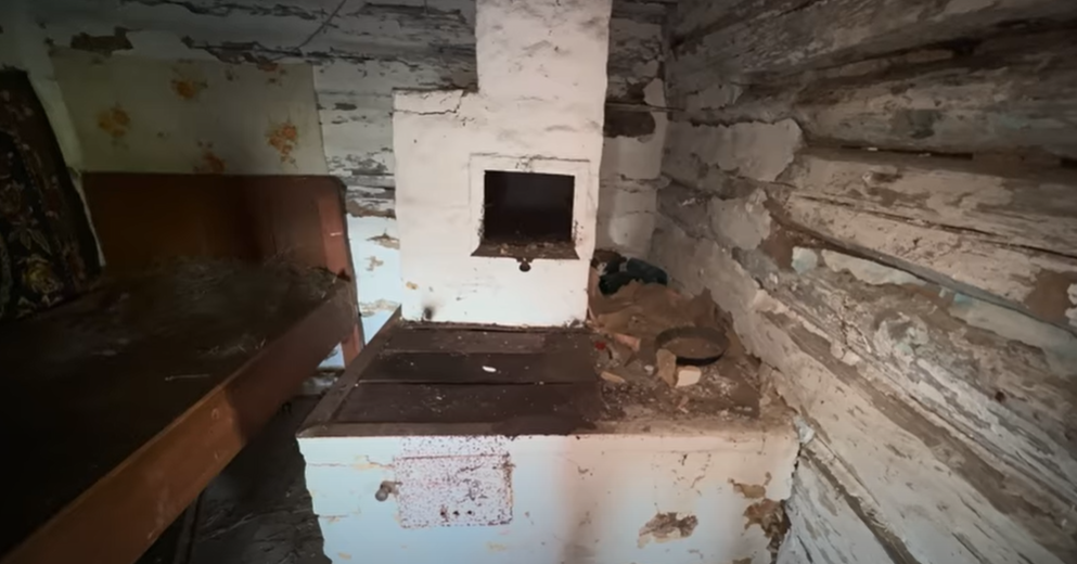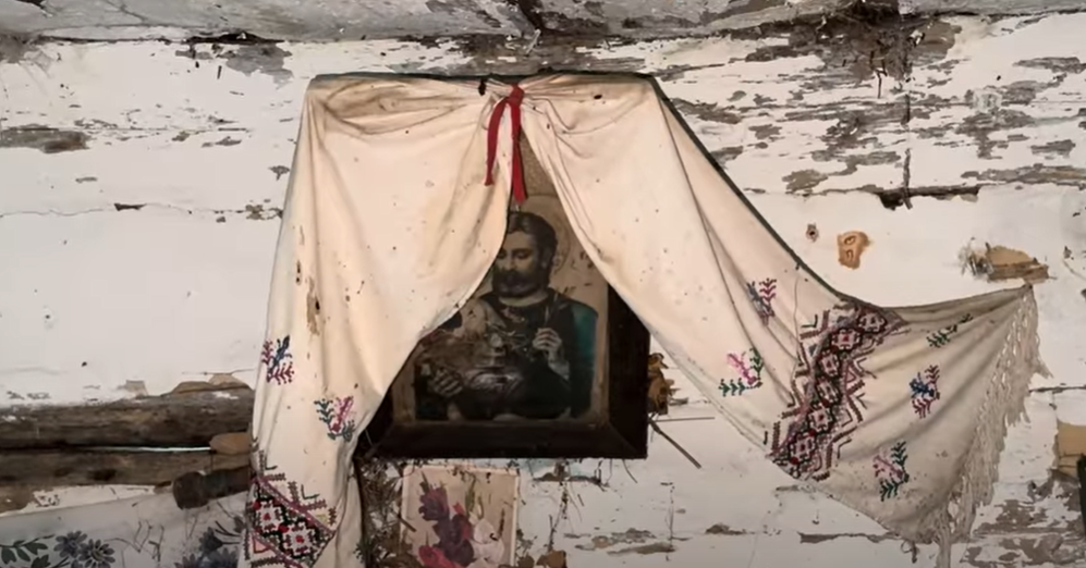 Чоловік змайстрував віника з гілок, аби замести всередині будинку. Там збереглись особисті речі колишніх господарів, а також сільськогосподарський інвентар, зокрема граблі та коса. Є стара піч, дерев’яне ліжко, килим на стіні, вишиті ікони.