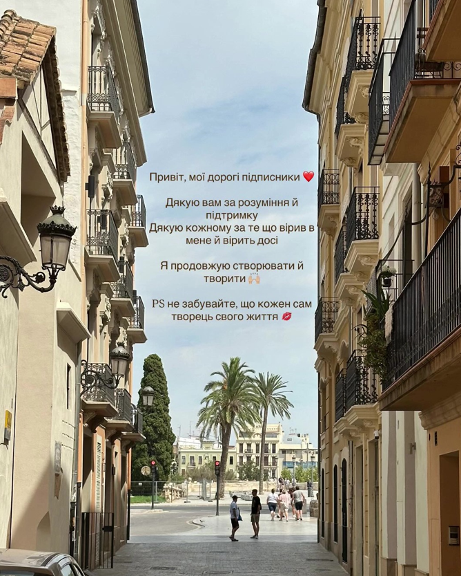 "Привіт, мої дорогі підписники. Дякую вам за розуміння й підтримку. Дякую кожному за те, що вірив в мене й вірить досі. Я продовжую створювати й творити. Не забувайте, що кожен сам творець свого життя", — написав він.
