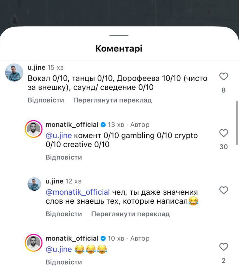 Діалог швидко привернув увагу підписників і зібрав десятки реакцій у коментарях. Однак згодом Монатік, ймовірно, видалив його, бо більше у коментарях перепалку не знайти.