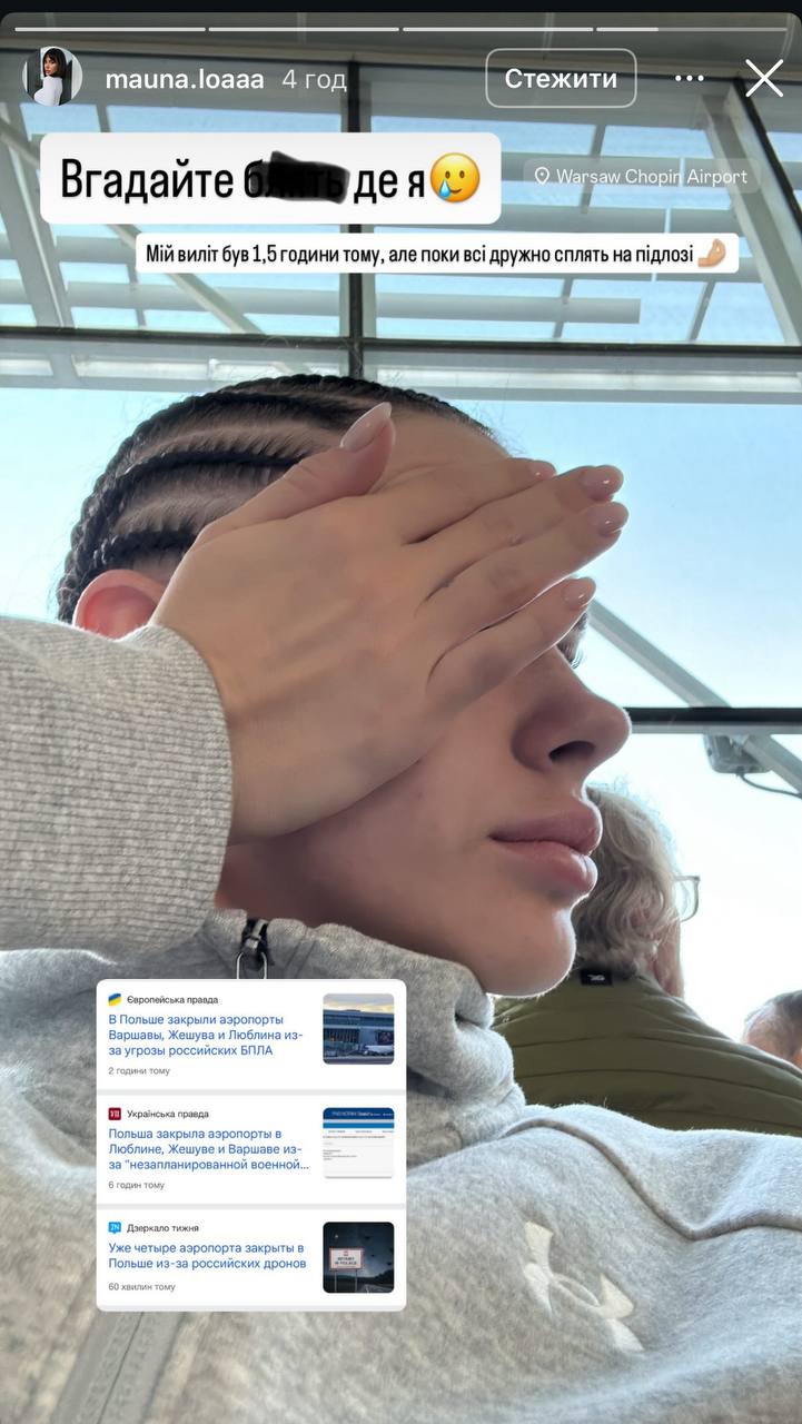 Дівчина блогера Олександра Волошина Аліна Миронець застрягла в польському аеропорту через атаку "шахедів". У ніч на 10 вересня Польщу атакували російські дрони, тому повітряний простір країни було частково закрито.