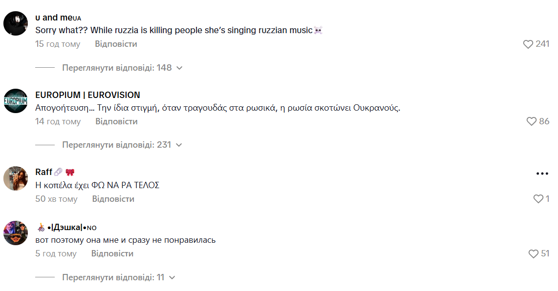 "Розчарування… У той самий час, коли ти співаєш російською, Росія вбиває українців", — написав один із користувачів грецькою мовою.