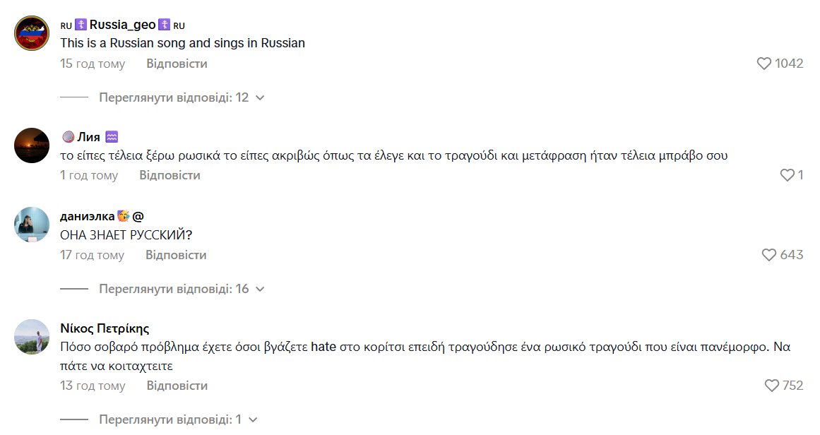 "Яка серйозна проблема у тих, хто ненавидить дівчину за те, що вона надзвичайно красиво заспівала російську пісню. Ідіть і подивіться на себе", — написав іще один користувач грецькою.