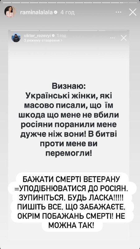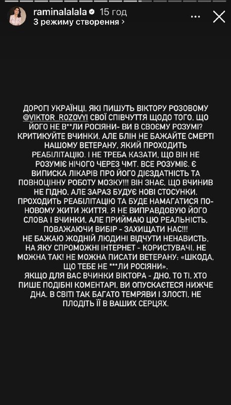 "Зараз будує нові стосунки, проходить реабілітацію та буде намагатися по-новому жити життя. Я не виправдовую його слова і вчинки, але приймаю цю реальність. Не бажаю жодній людині відчувати ненависть. Не можна так! Не можна писати ветерану: "Шкода, що тебе не ***ли росіяни". Якщо для вас вчинки Віктора — дно, то ті, хто пишуть подібні коментарі, ви опускаєтесь нижче дна", — додала вона.