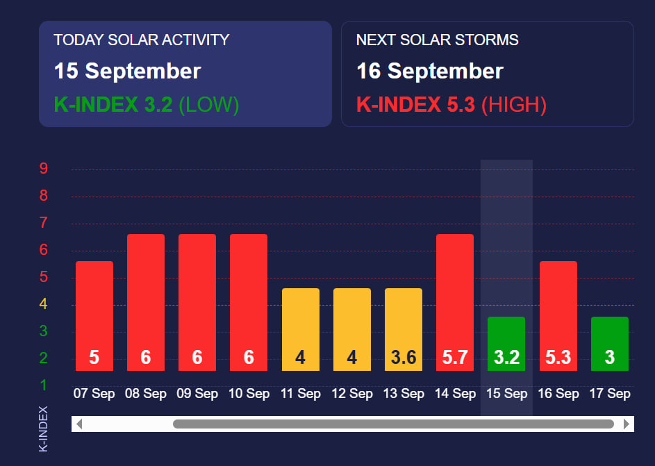 Отже, активність магнітного поля Землі протягом цих днів коливатиметься від низького до високого рівня, з піком 16 вересня, коли можливі помітніші наслідки для здоров’я та роботи техніки.