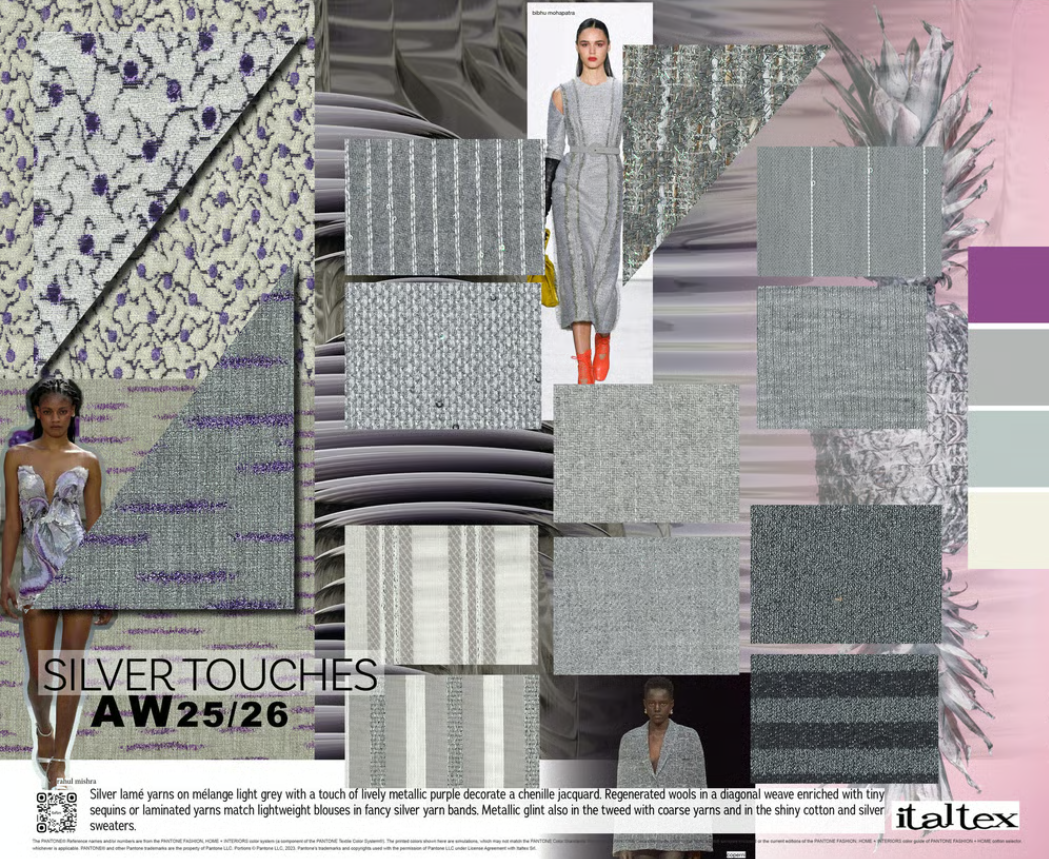 Металізовані деталі стають особливо помітними. Сріблясті люрексові нитки на сірому меланжі з фіолетовим відливом прикрашають жакардові тканини, а легкі блузи з срібними смужками виглядають святково й сучасно. Металевий блиск також простежується у твідових текстурах, блискучій бавовні та светрах із додаванням срібних ниток.