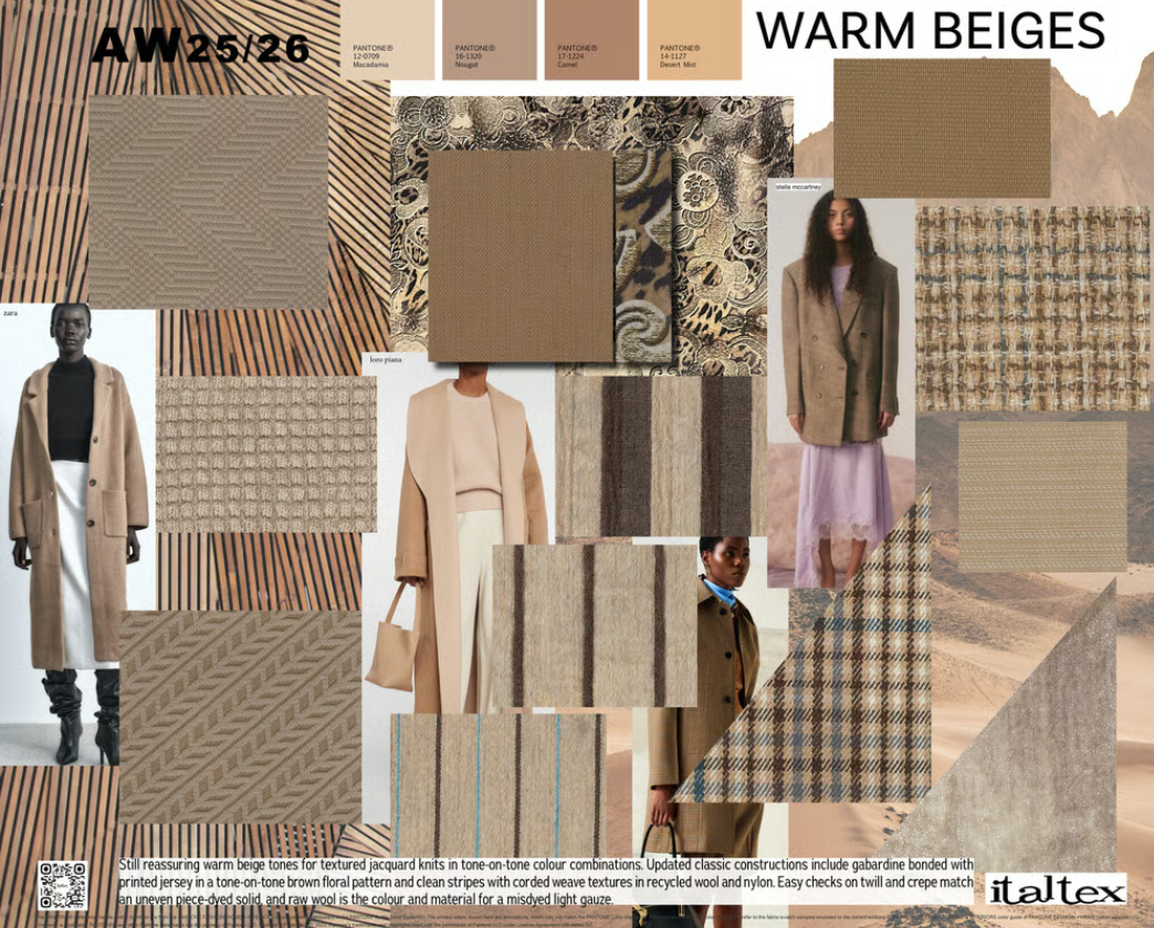 Натуральні бежеві тони створюють відчуття затишку в жакардових в’язаних тканинах із тональними поєднаннями. Класика набуває нового звучання: габардин у поєднанні з трикотажем у коричневих флористичних візерунках, смугасті фактури з переробленої вовни й нейлону та легкі картаті варіації на твілі й крепі. Вовняний газ – ще одна з ключових тканин у цій гамі.