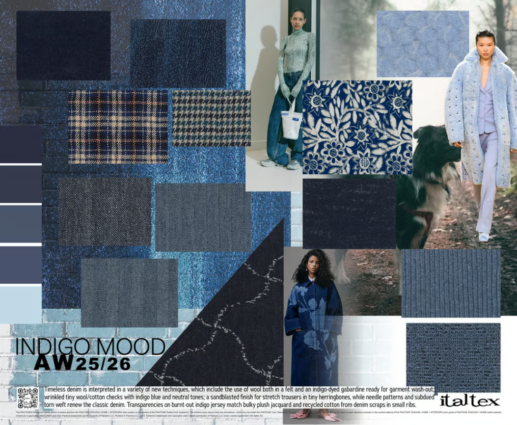 Джинс залишається поза часом, проте отримує сучасну інтерпретацію. Серед рішень – вовняний габардин індиго для подальшого "випрання", зморшкуваті клітинки з поєднанням синього та нейтральних відтінків, а також стрейчеві тканини з ефектом "піскострую". Прозорі індигові джерсі гармонійно поєднуються з об’ємними жакардами та переробленою бавовною з джинсових відходів.