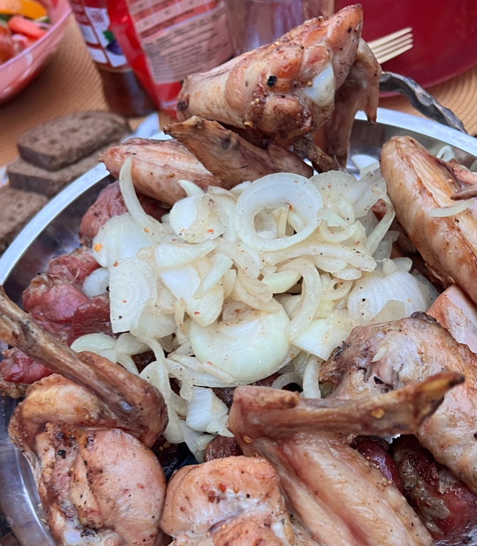 Господар продемонстрував свої кулінарні здібності, приготувавши шашлик та картоплю з цибулею. На вечері просто неба панувала невимушена атмосфера.